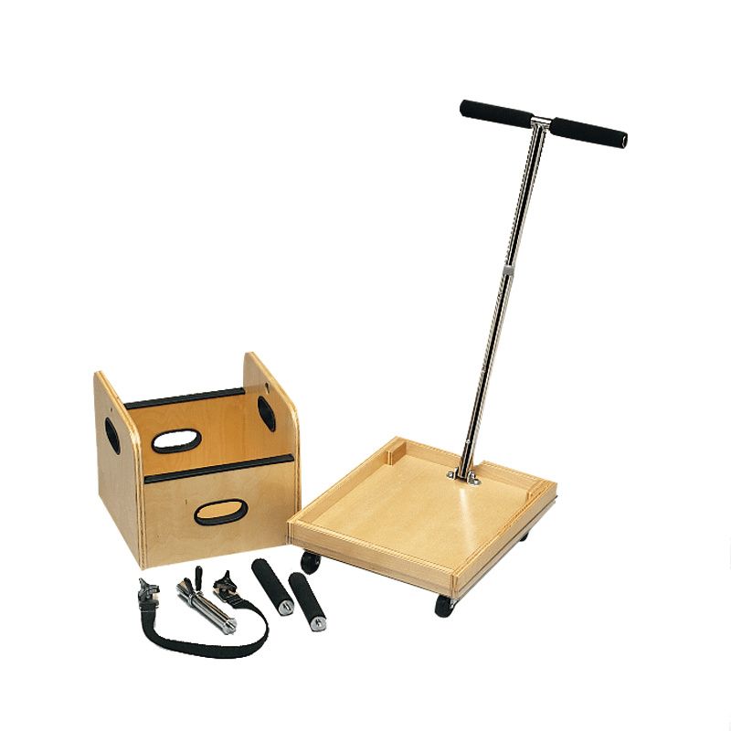 Bailey Work Device: A combination lifting box and push cart for work simulation, conditioning & evaluation. Featuring a strap, foam-covered hand grips and hand slots for lifting. The cart promotes push/pull activities and has an adjustable handle for height and angle.